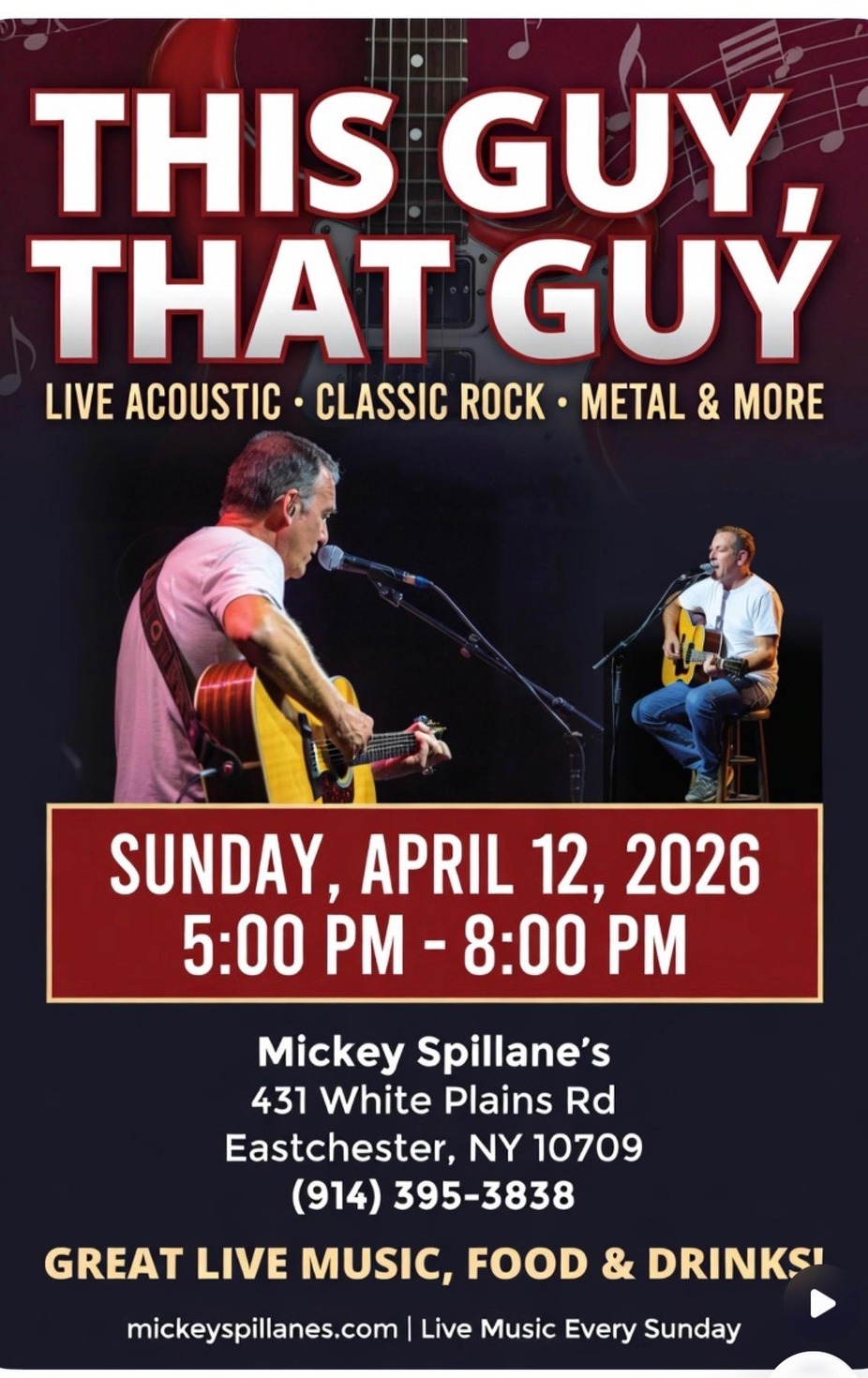 Join us at Mickey Spillane’s for an evening with This Guy, That Guy bringing you live acoustic, classic rock, metal & more! 🎶